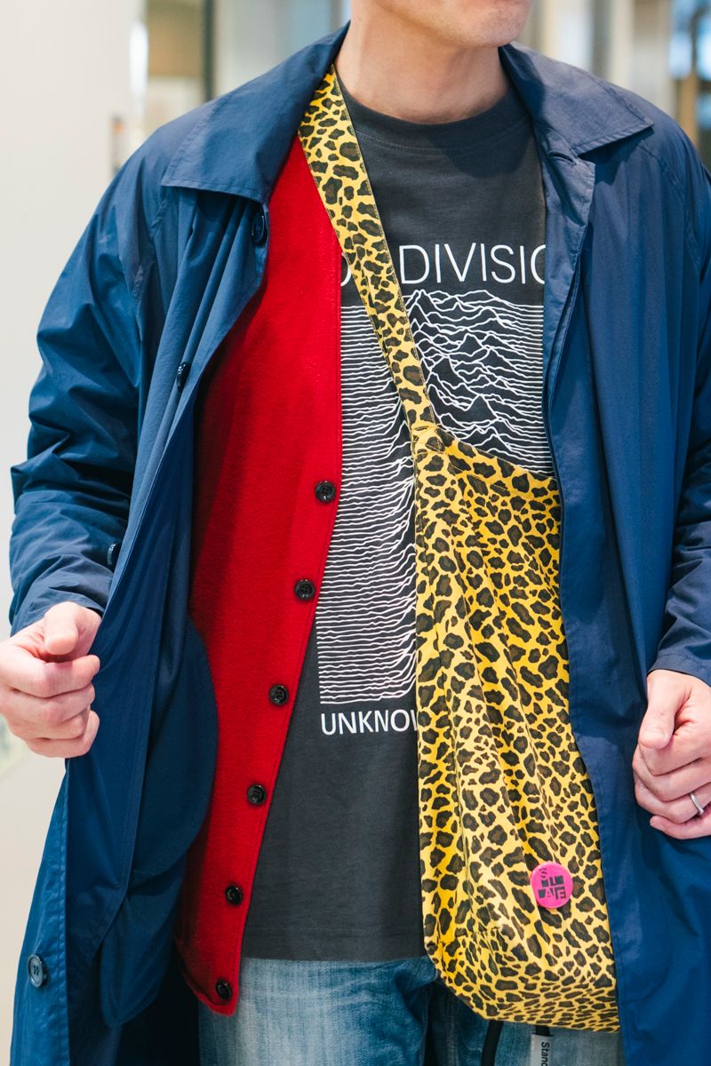 その安定感抜群のコンビを、古着のアーティストT&赤いカーディガン&ヒョウ柄バッグで鮮やかに個性出し。シメには紫のカラーソックスを抜擢して、四方隙なしの構えに。
