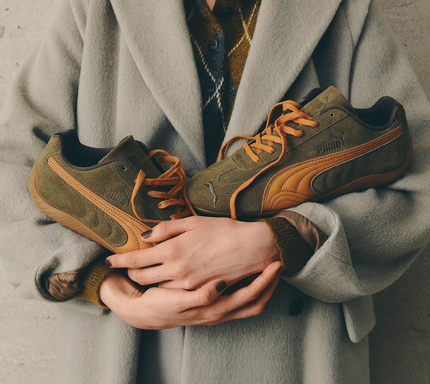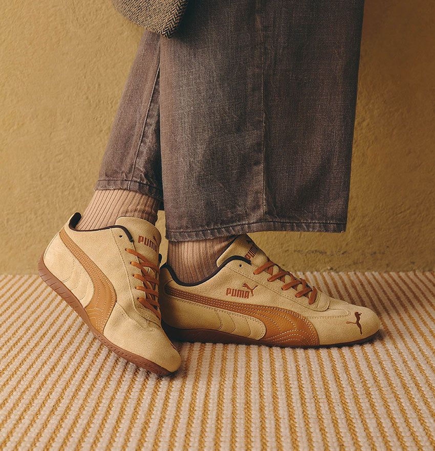 アッパーにはニュアンスのあるウォームトーンをあしらい、冬の着こなしに柔らかい温度感をプラスする。街の空気が冷たくなる季節、足元に温度と余裕をつくる一足として、これまでのスピードキャットにはなかった“リュクスな佇まい”が魅力だ。