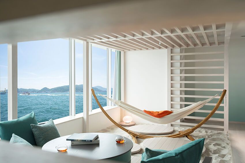 エメラルドグリーンを基調とした部屋はいずれも全室海峡ビュー、絶え間なく船が過ぎゆく景色を楽しめる。なかでもよりリゾート感が味わえる部屋が、4名定員の「海峡カバナスイート」。