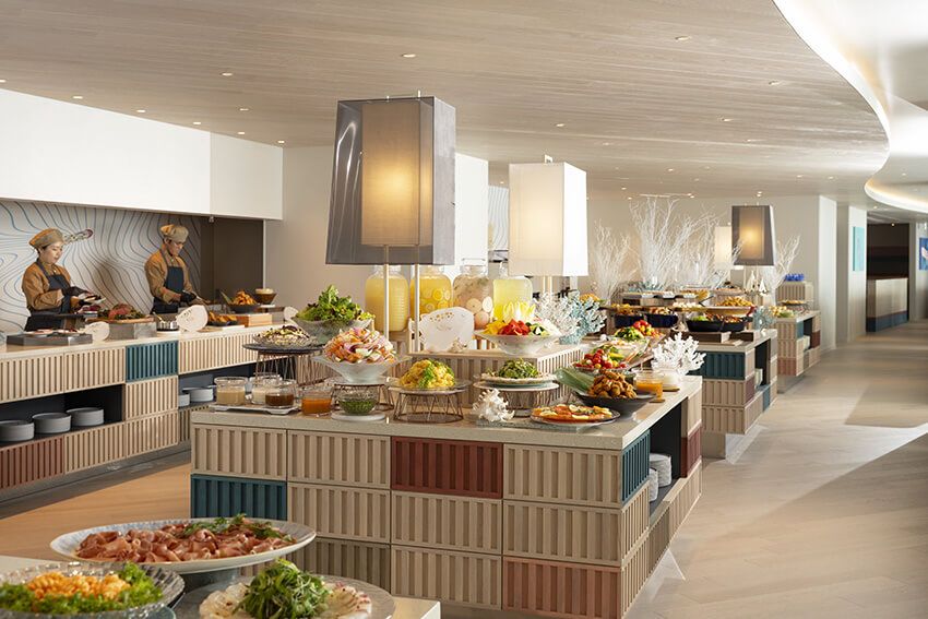 もう少しカジュアルなディナーを希望するなら、ビュッフェダイニング「プクプク(PUKU PUKU)」へ。朝食もこちらのビュッフェスタイルだが、洋食のみならず、瓦そばや海宝丼といったご当地グルメも合わせて楽しめる。