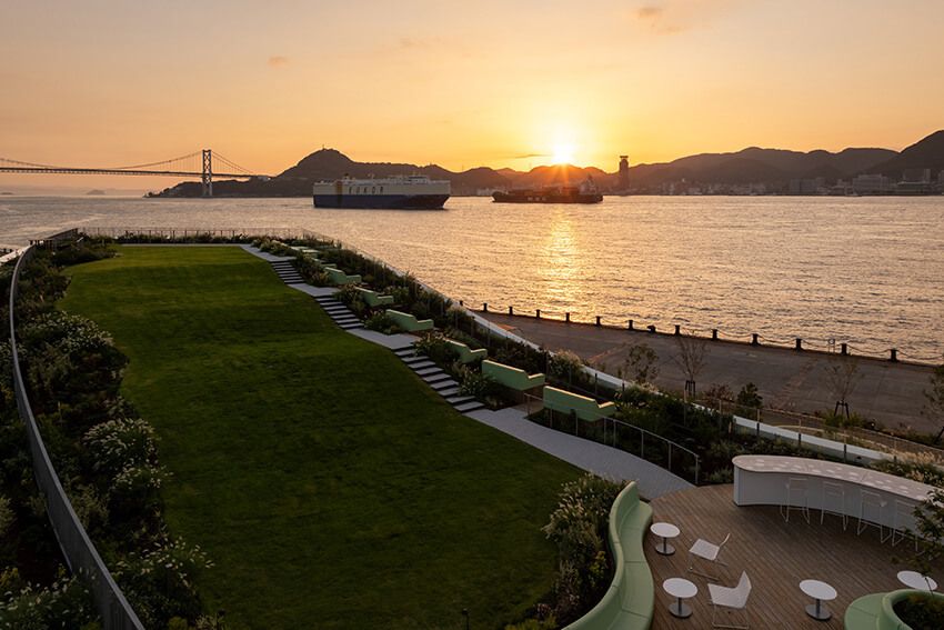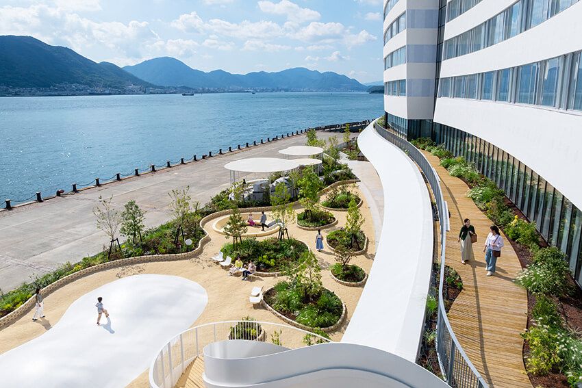 船のフォルムやふぐといった下関のアイコンを取り入れ、曲線を活かしたランドスケープデザインは風景に溶け込み、遊び心も感じさせる。ファサード(外壁)やロビーなど、いたるところで目に飛び込んでくる水玉はふぐに着想を得たデザインだ。