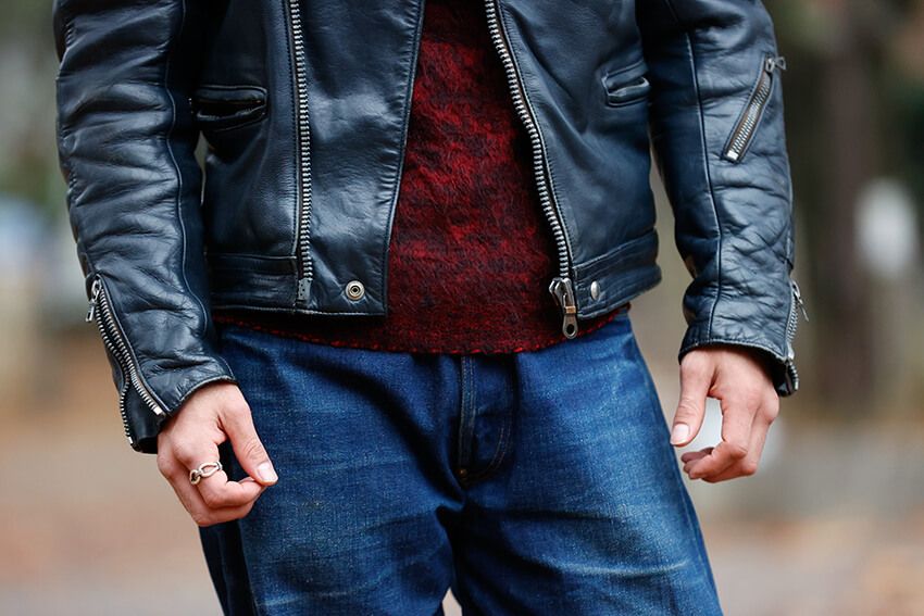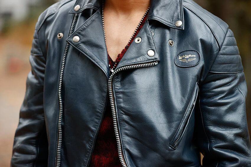 ――今日のコーディネイトを教えてください。まずはアウターからお願いします!堤 これは「ルイスレザーズ」のヨーロッパ。おそらく’70年代の個体ですね。この深いネイビーの色みに惹かれました。