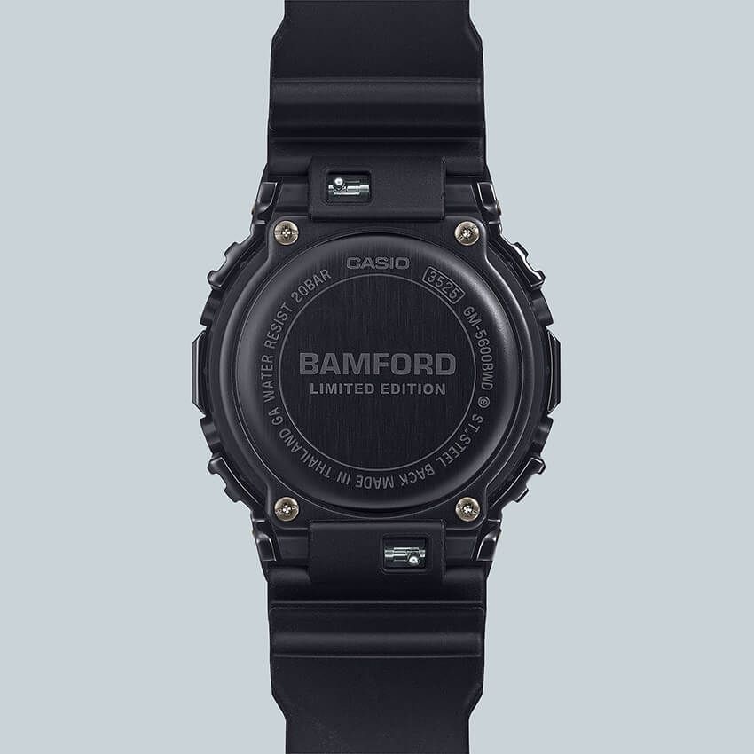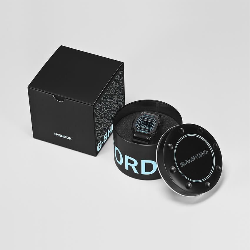 G-SHOCKのタフさをさらに引き立てるオールブラックを基調にしつつ、随所にライトブルーを効かせた今回のコラボモデル。なかでも、ストラップ全体に配した「5600」と「BAMFORD」のレタードは、本作を象徴するスペシャルなディテールだ。