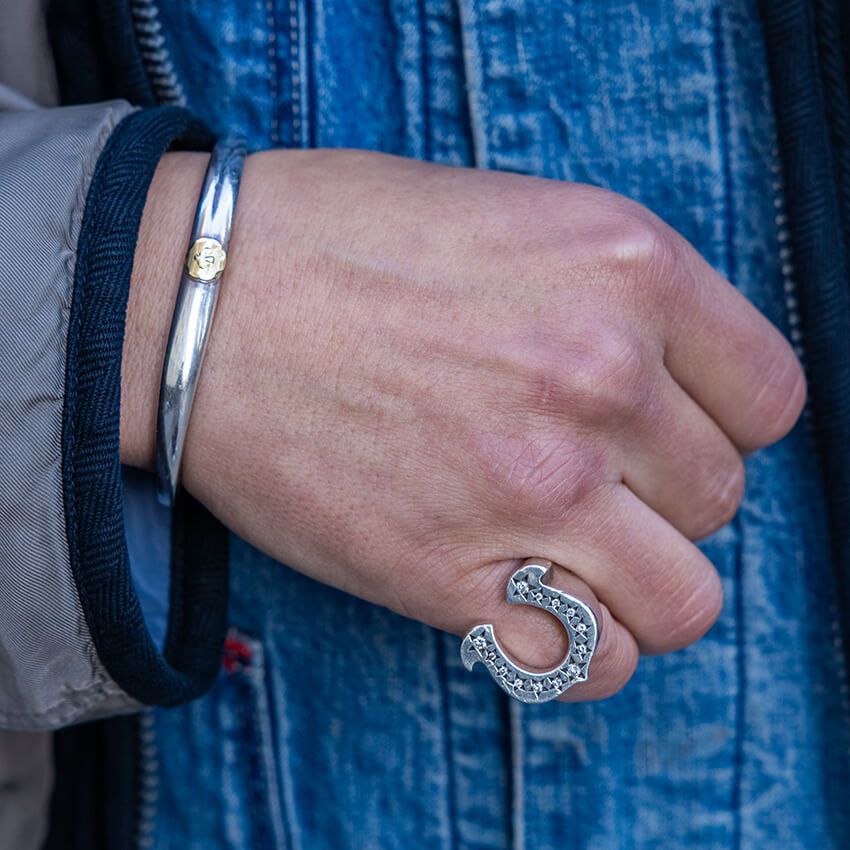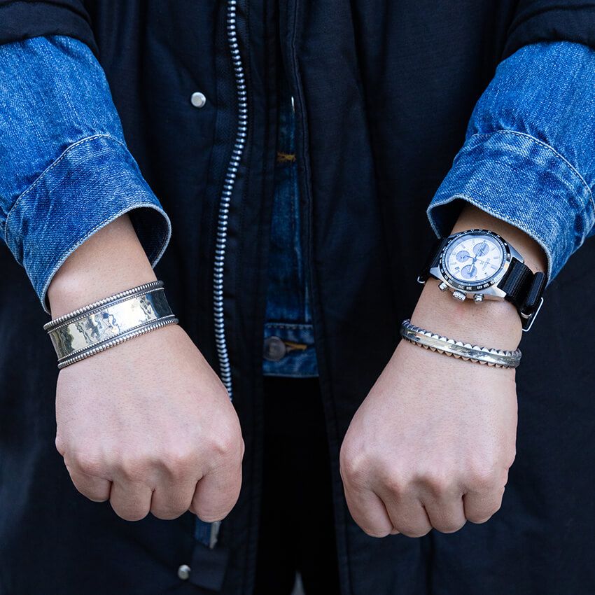 ジャケット、中に着たジャケット=不明 カットソー=マウリッツ・エッシャー パンツ=古着 靴=ニードルズ 腕時計=オリス ブレスレット=エルメス、カルティエ
