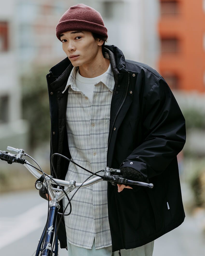 インナーダウンをセットすると、アウトドアブランドのダウンらしいボリューム感と、ブラックのカラーリングがもたらす都会的なムードが同居。