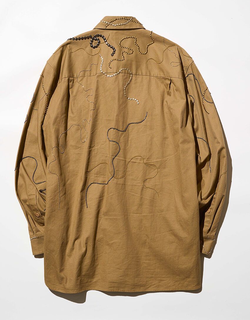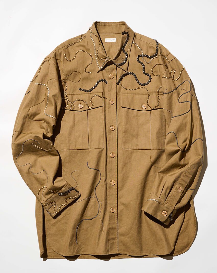 ランダムにスタッズが打ち込まれたショーピースのシャツに一目惚れ。クラフツマンシップの極致を感じる1枚は、袖を通すと気分が上がる。