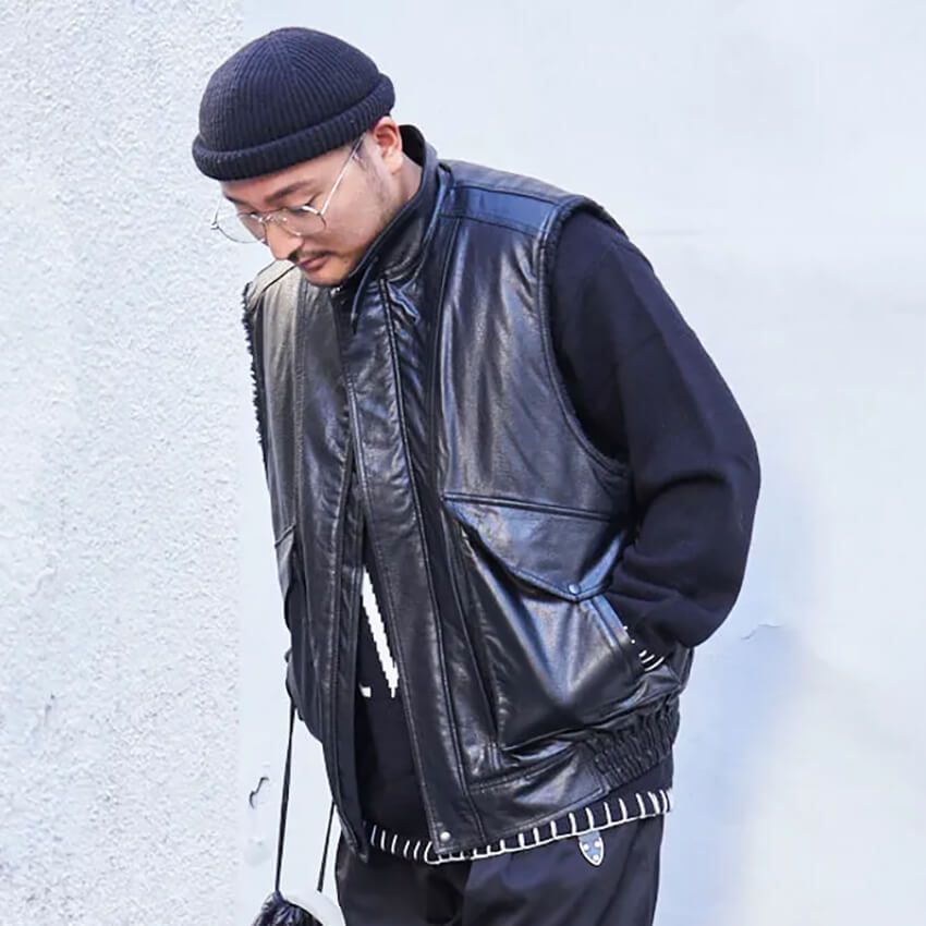 ハイからローまで幅のあるアイテム選びが光るなか、ベストと質感が似たシテンのミニバッグも実に効果的。手垢のついた言い回しで恐縮だが、まさにクロウト的チョイスである。
