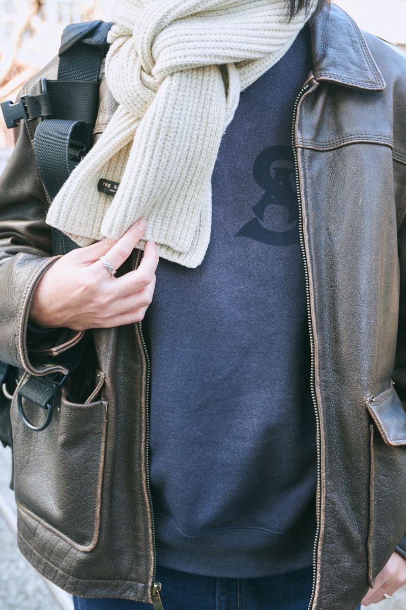 ジャケット、帽子=ともに古着 スウェット=シンクロニシティアーカイヴス デニム=トゥエモントレゾア シューズ=ナイキ バッグ=パックバッグ 腕時計=ラグアンドボーン×カシオ マフラー=ラグアンドボーン リング=ジルサンダー