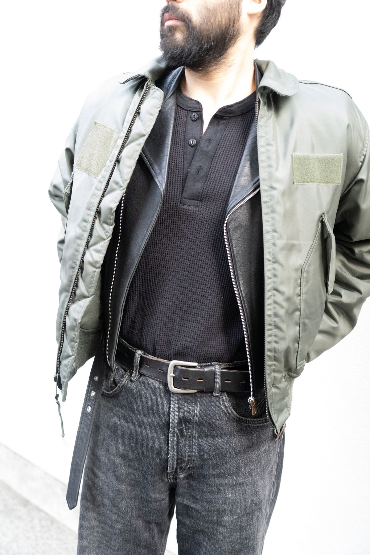 インナーにライダーズを挟み、サーマルシャツはブラックカラー、デニムはフレアシルエット……そのどれもに「新しさ」が宿っている。ファッションを知り、進化させる気概があるからこそ成せるワザである。