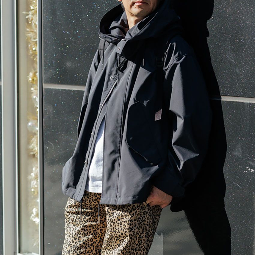 WAY OF LIFE。生き様をテーマとするジャパンブランドのシェルパーカに、同じく日本のクーティープロダクションのパンツをセット。ルーズな合わせをダークトーンでシュッと魅せた。