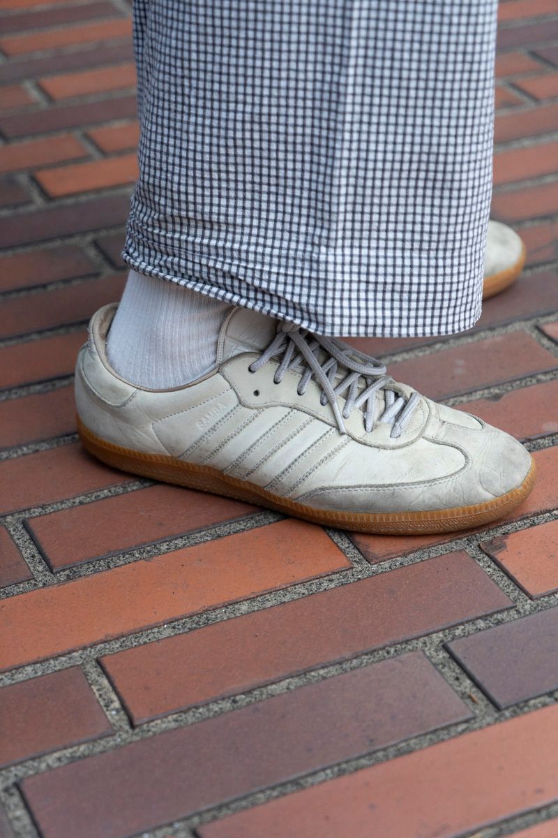 ⑤ チェックパンツと白スニーカーで清潔感をプラス