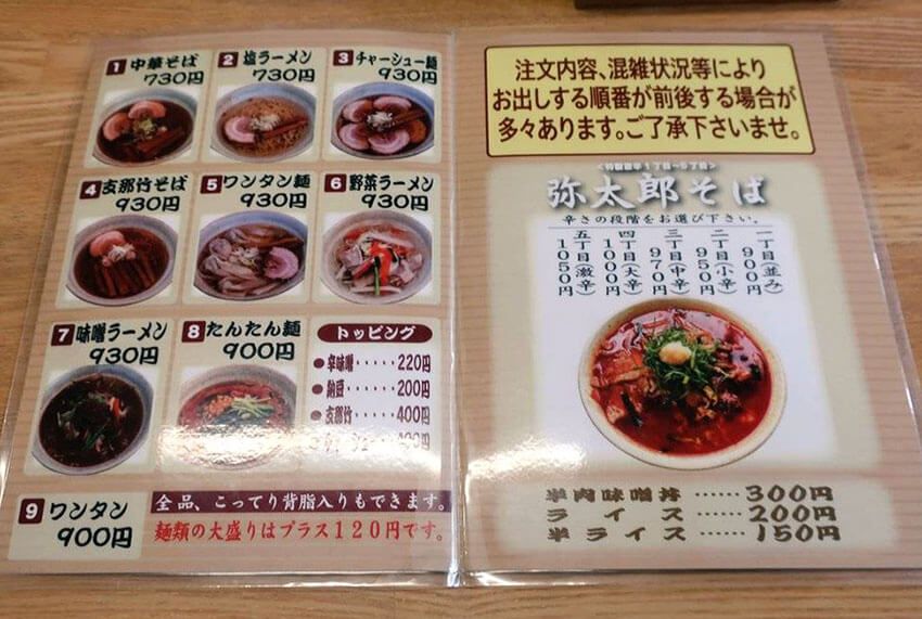 同店が提供するレギュラー麺メニューは、「中華そば」、「塩ラーメン」、「味噌ラーメン」、及び、屋号を品名に冠した辛系の「弥太郎そば」など。「一丁目(並み)」から「五丁目(激辛)」まで、五段階から辛さが選べる「弥太郎そば」も、多くの固定ファンを擁する人気商品だが、初めて訪問されるのであればやはりメニューリストの筆頭を飾る「中華そば」が鉄板だろう。同店ではすべての品を「こってり背脂入り」にすることが可能であり、個人的には「こってり」指定がお薦めだ。