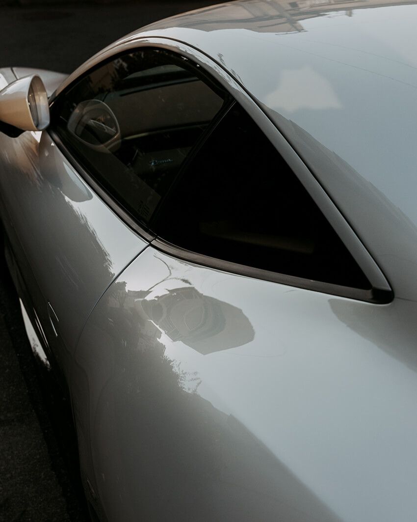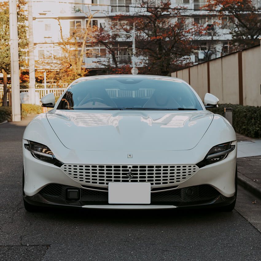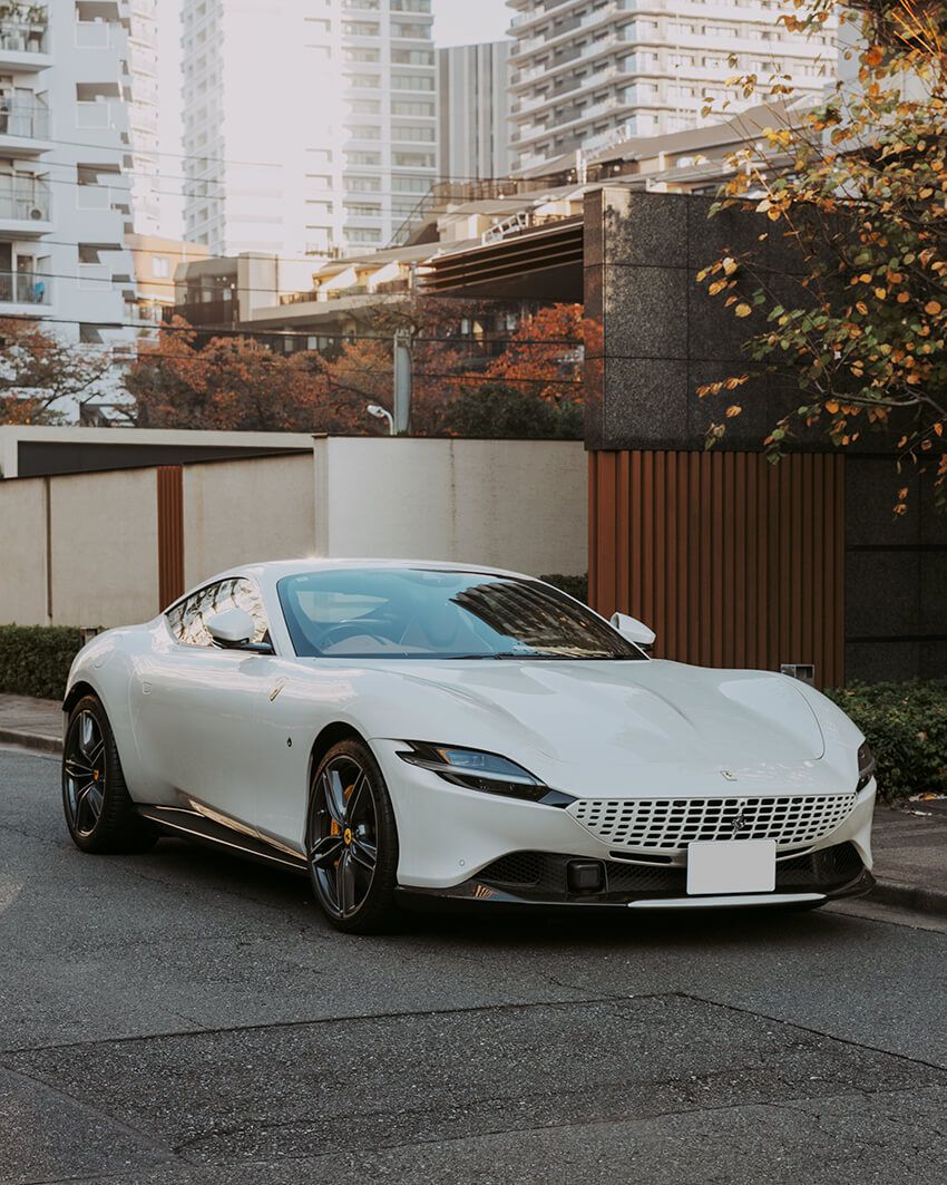 【写真26点】「『基本“純正派”、エンジン音も味わいたい』プロボクサー・井岡一翔が拳で掴んだフェラーリを大公開!」の詳細を写真でチェック目黒の住宅街に静かに止まった「フェラーリ・ローマ(Ferrari ROMA)」。冬の光を浴びて際立つボディラインに思わず目を奪われる。
