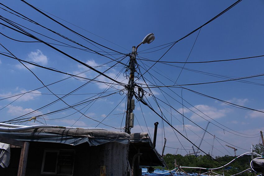 建物の周りにはプロパンガスが設置され、洗濯物が干されている。キムチを漬けるツボも目についた。通路は比較的キレイだったが、ゴミ置き場には大量のゴミが放置されていてかなり汚く、悪臭も鼻についた。上を見上げると、これでもかというくらい大量の電線が絡み合っている。漏電して火事になることもある。かなり大きな火事も起きて、それも再開発に拍車をかけたと言われている。