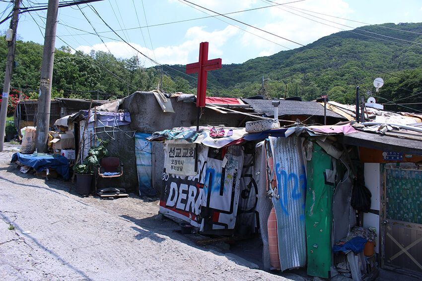 ポツポツと十字架が建てられているのが見えた。教会だ。韓国では宗教の中でキリスト教の信者が最も多い。そのため町中にもたくさんキリスト教会があるが、スラム街の中にもやはりある。