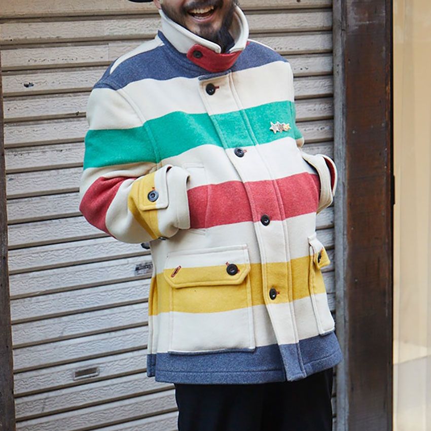 ▶︎YUKIさんのスナップをすべて見るYUKIさん(30歳)ブルー、グリーン、レッド、イエロー……文字通りカラフルなボーダーのコートはその笑顔にも増して明るい印象を授けてくれる。