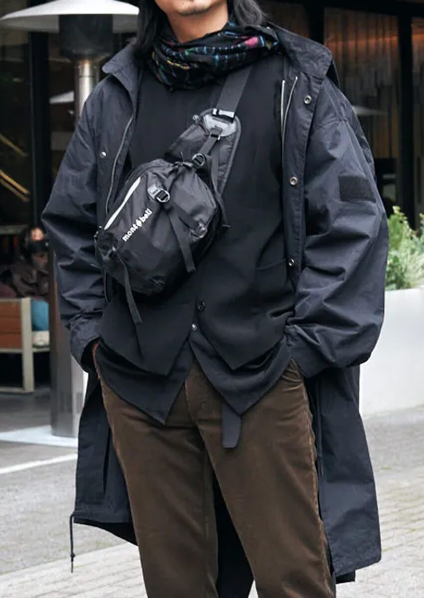 シンプルなデザインながら、スタンドカラーやフィッシュテールが程良くアクセント効果を発揮する。この手のシャカシャカ素材のコートはメリットを挙げたらキリがないが、薄手でゆったりめだと中に着込んでも問題ないというのが実はいちばんうれしかったりする。ほら、こんな豊かなレイヤードスタイルだって難なく楽しめる。