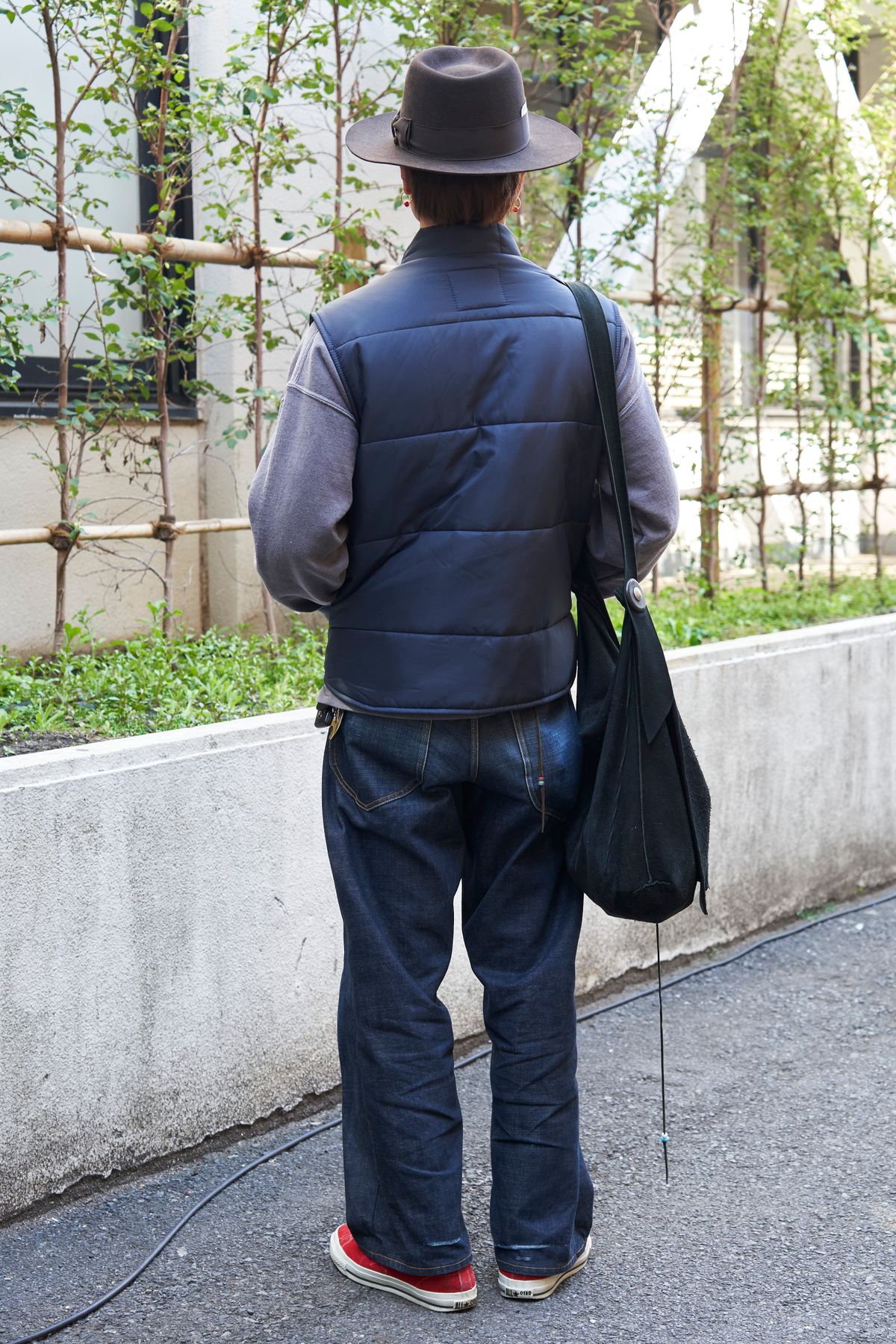 ▶︎りょうすけさんのスナップをすべて見るりょうすけさん(31歳)シャイニーなネイビーのダウンベストに、青味がかったグレースウェット、濃いめのブルーデニム。流れるようなブルーグラデーションを、主張の強い黒子たちとともに。