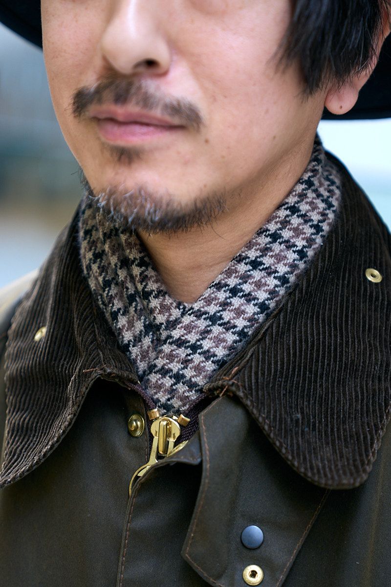 ▶︎恭平さんのスナップをすべて見る恭平さん(42歳)続いてもリーバイス&バブアーという顔合わせながら、ダークな配色がシックな印象を強調。ハウンドトゥースのマフラーとツバ広のハットも、エレガンスを補強する。