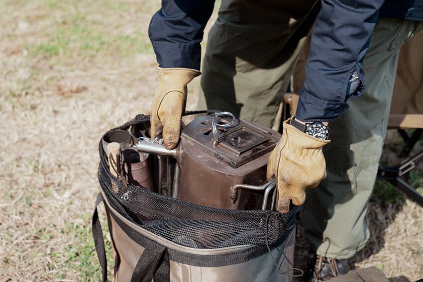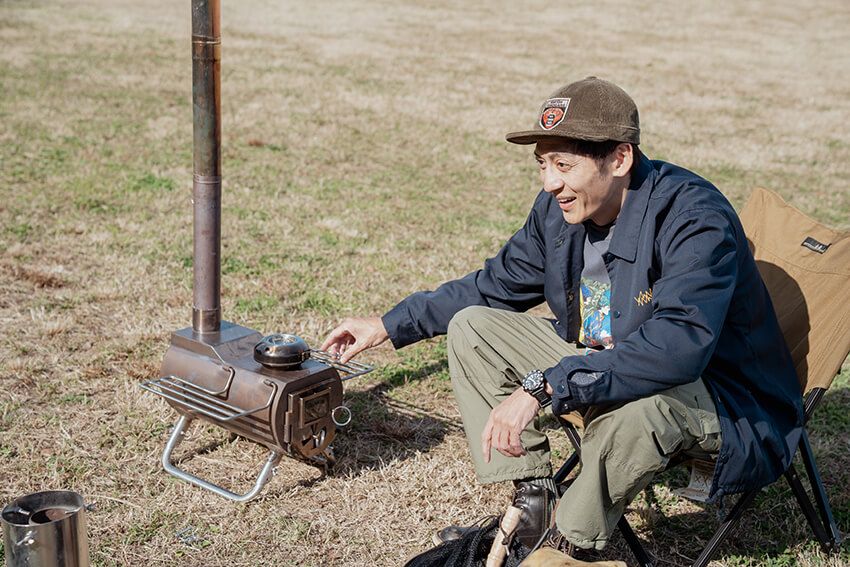 最近のキャンプギアは本当に進化していて、痒いところに手が届く。このテントの特徴はぺろっとめくれる穴があって、そこから煙突を出せるので、テント内で薪ストーブが焚けるんですよ。これとテントさえあれば、真冬でもTシャツで過ごせるくらい暖かくなるので、冬のキャンプには必須ですね」。