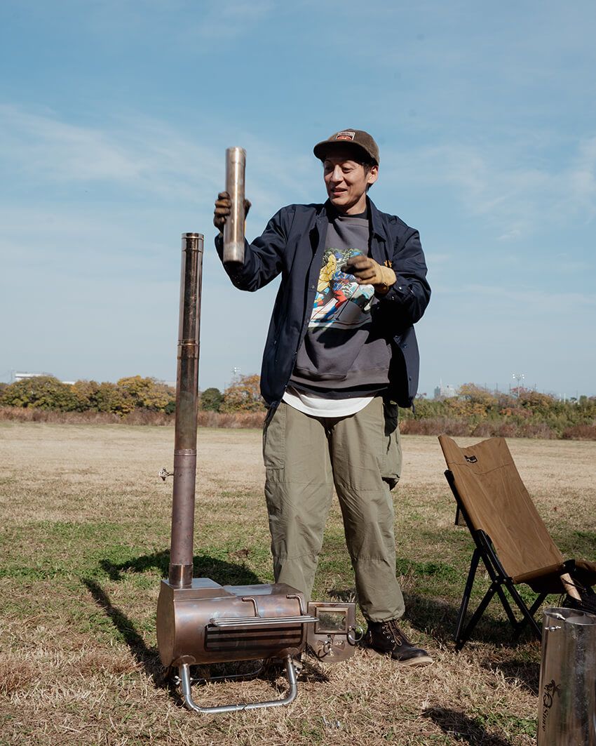 組み立てた煙突は村田さんの背丈を超える。高さがあると上昇気流が起きるため、スムーズに排気してくれるのだとか。