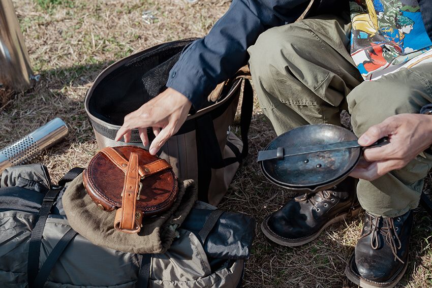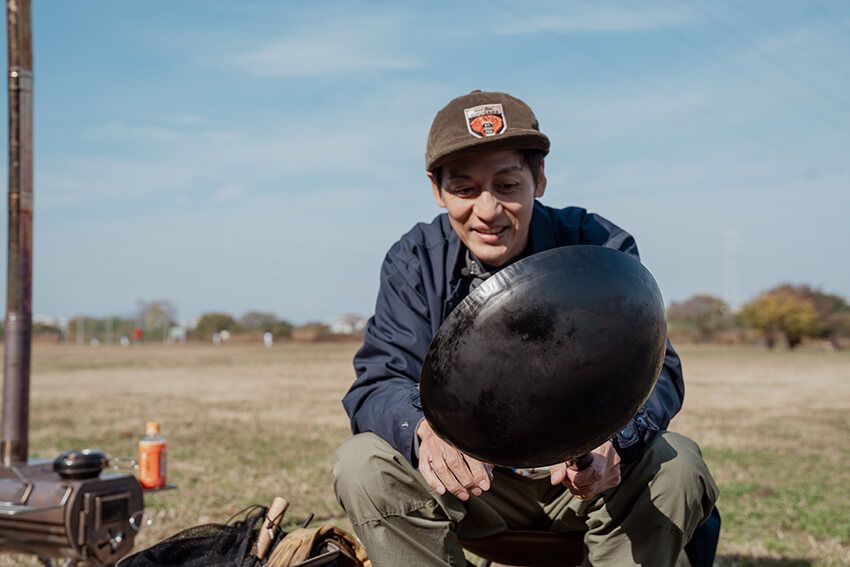 「このコンパクトフライパンは、めっちゃいいですよ。4年前に購入してから、キャンプには必ず持っていってます。鍛治職人が一つひとつ手で作っている鉄のフライパンで、打ち付けた目をあえて残してるので食材がくっつきにくい。焦げにくいので助かります。