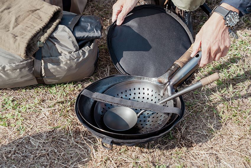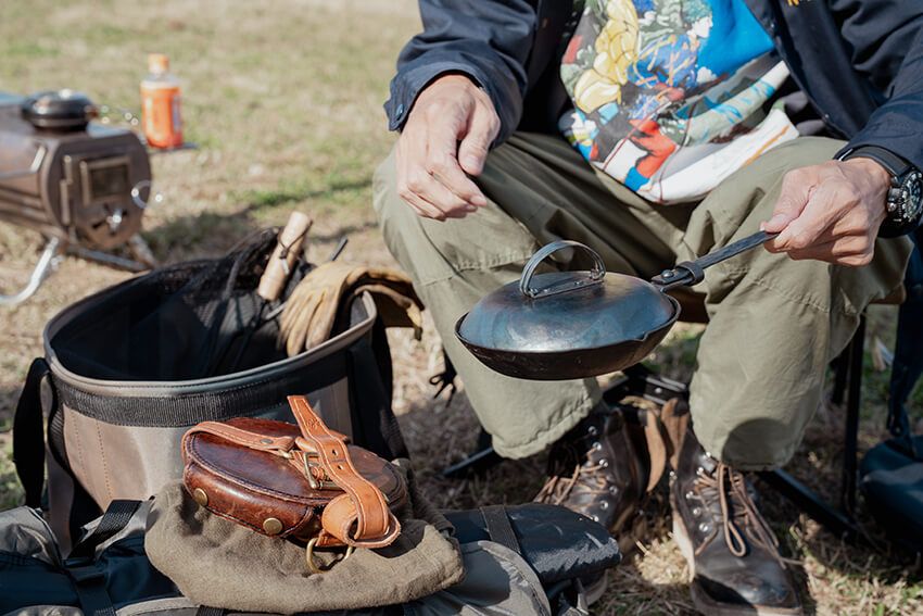 「古臭いものが好き」と話す村田さんが見せてくれたギアは、アンティーク感を漂わせるものばかり。次に紹介してくれたのは鉄のフライパンと、キャンプには似つかわしくない中華鍋だ。