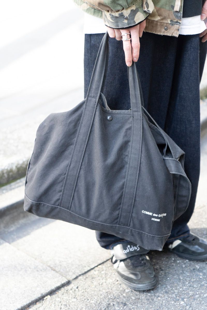 繋ぎ役となる白Tのヌケ、ダッドなアディダスを覆うデニムのタマリ具合など、シンプルに見えて細部の演出は抜かりなし。こなれ感ある“ギャルソン”のバッグ選びもセンス良し!