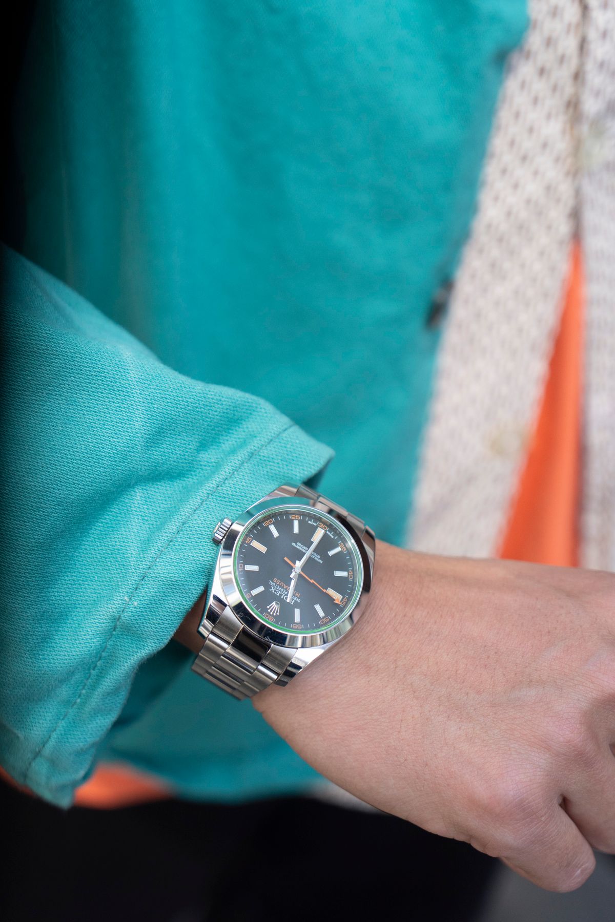 ダウンベスト=ロッキーマウンテンフェザーベッド ジャケット、シャツ、Tシャツ、パンツ=すべて古着 シューズ=ジーエイチバス×ユナイテッドアローズ 腕時計=ロレックス