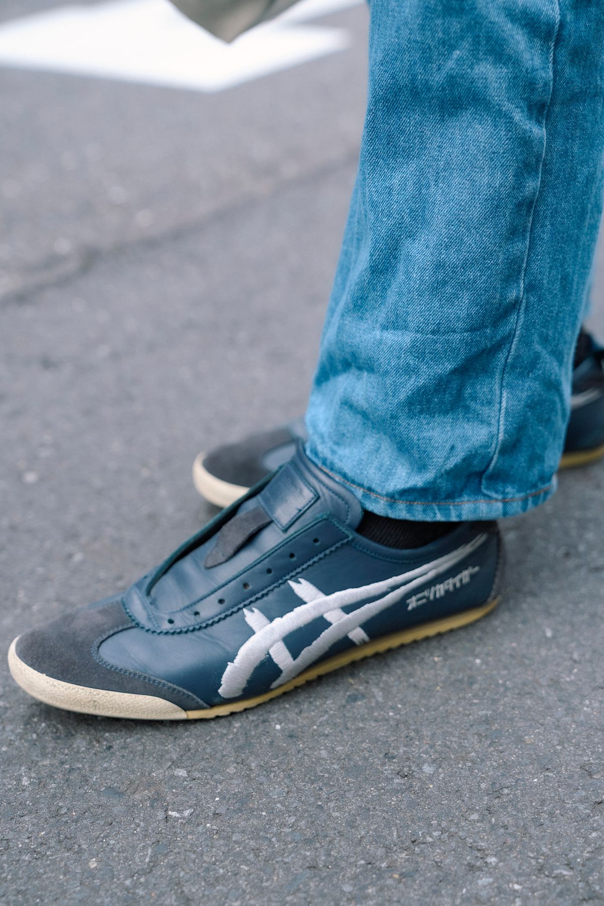 インナーにはスウェットとストライプシャツを重ねて、品のいい大人カジュアルを徹底。かたや、足元は遊びあるスリッポンでリズムチェンジ。さすがっす。