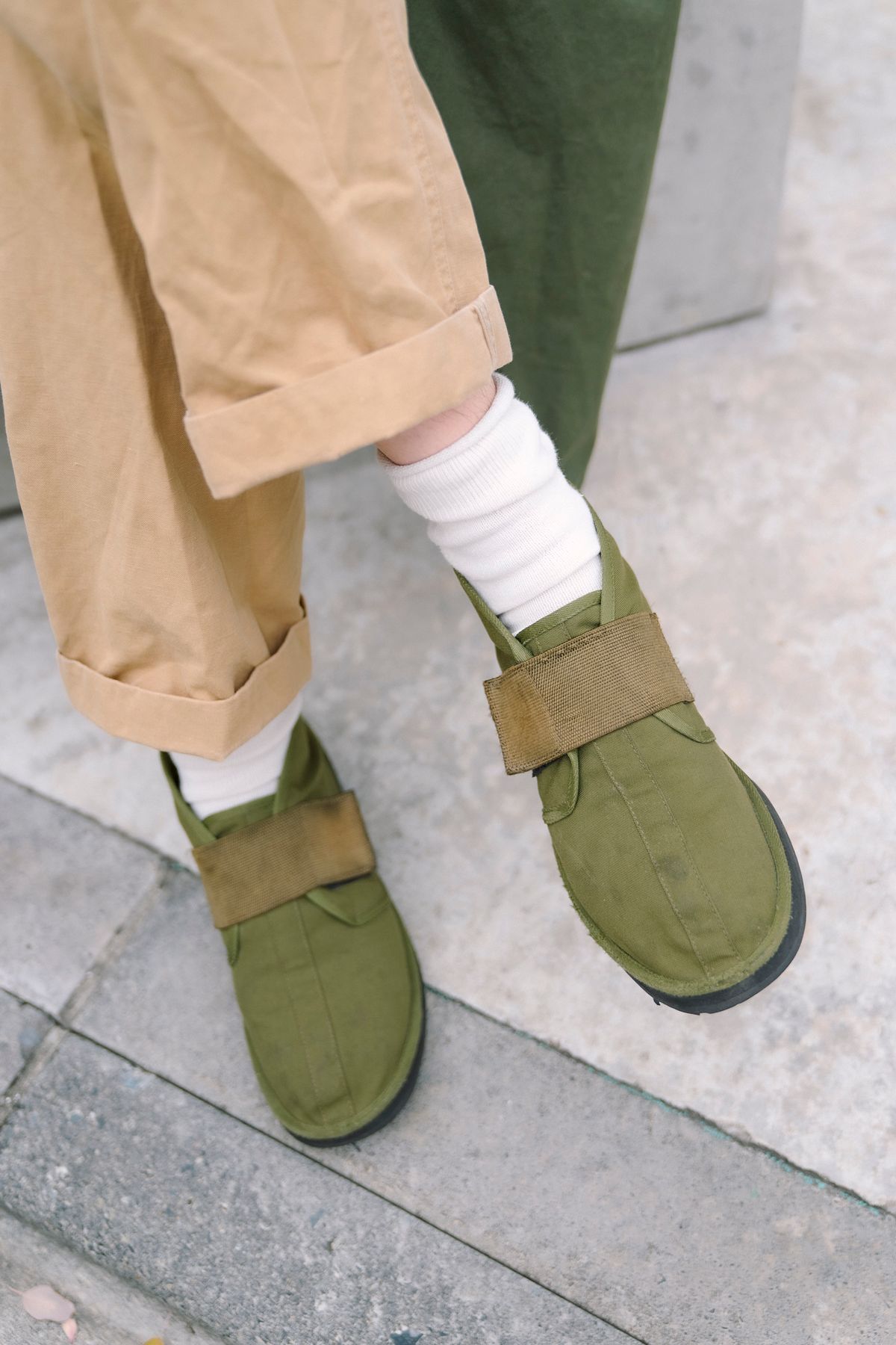 トップスはオリーブのグラデーションで魅せ、同じくオリーブの変形シューズでブラウンのパンツをサンドイッチ。ナチュラルなグレーヘアを含め、全身淀みなく決まってる!