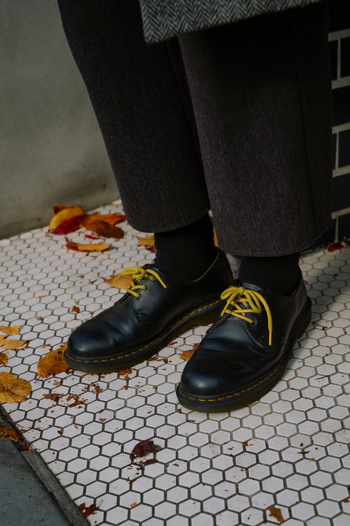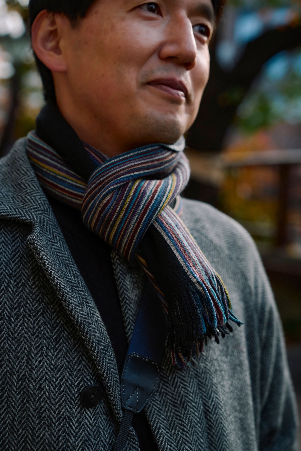 ▶白澤さんのスナップをすべて見る白澤凌一さん (30歳)独特なムードを漂わせる多色織りのコートで、ブラックで揃えたインナー&パンツを華やかに昇華。ユニークな色彩センスは、青と黄を組み合わせた足元のチョイスにも表れる。
