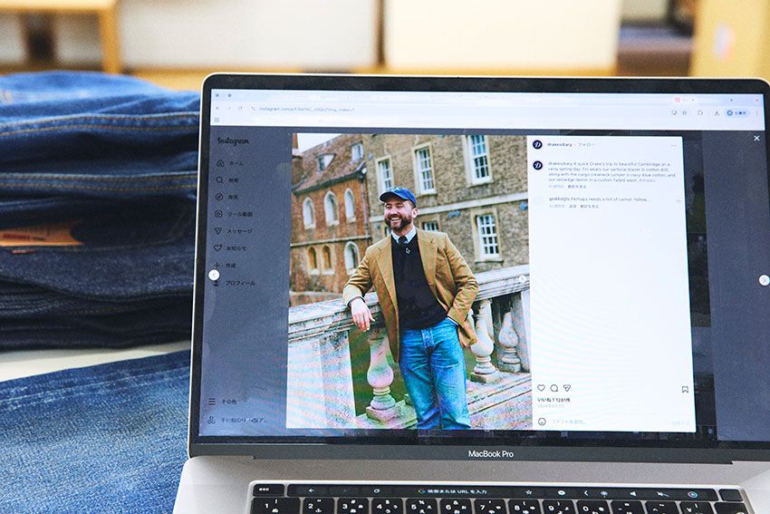 その時にドレイクスのイメージビジュアルで発表されたスタイリングが、インディゴブルーのジーンズにツイードのジャケット、足元はチャッカブーツ。モダンなニットやスエードのカバーオールも合わせていてめちゃくちゃかっこよかったんです」。
