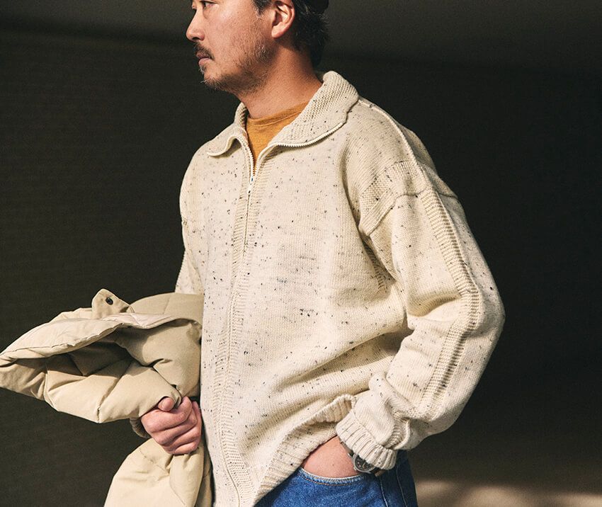 「今回はカレドアーのダウンベストにジップアップニット、そしてリーバイスを合わせました。おそらく同世代のクラシック好きからしてみたら王道な組み合わせですが、色味やサイズ感に配慮すればもたつかない。この圧倒的な応用力こそリーバイスが世界共通言語である理由。歴史や服作りを知るほどに、そのブランド力を実感します」。