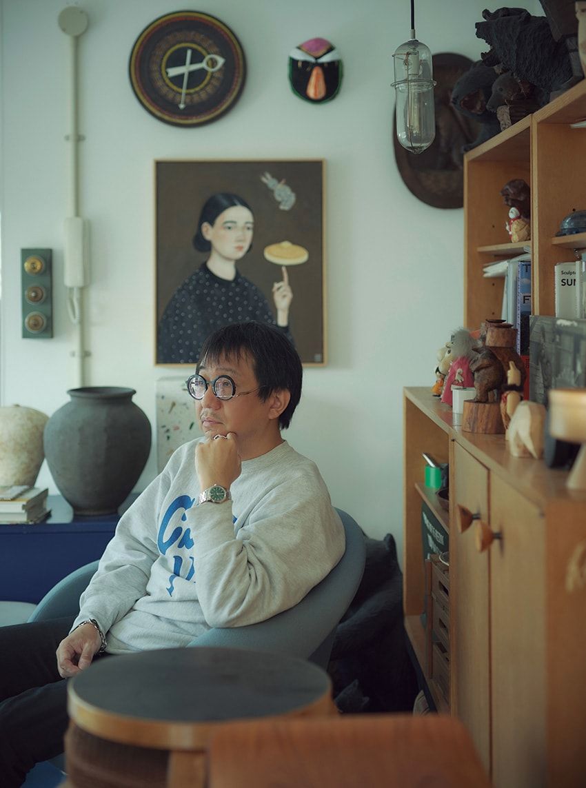 オフィスをぐるりと見れば、ジョージ・ネルソンの本棚には書物より木彫りの熊が多めに置かれ、建築家・藤森照信によるテーブルセットの卓上には数えきれないほどの時計が無造作に。かように名品珍品がそこかしこに置かれ飾られていた。