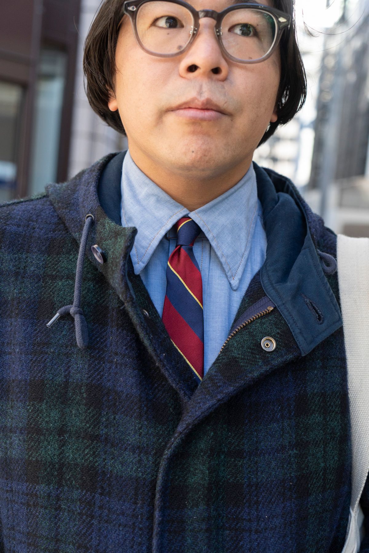 チェック柄のトラディショナルな雰囲気を活かし、インナーはブルーシャツとレジメンタルタイによるプレッピーな合わせを実践。“好き”が伝わるオリジナル!