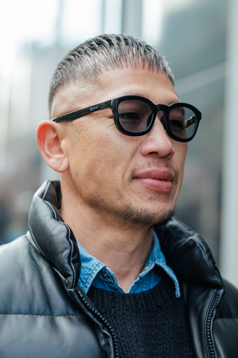 襟元から覗くデニムシャツだって、軽快と重厚の中庸をいくいい塩梅。すっきりした髪型とアイヴォルのサングラスという合わせにも、確たるスタイルを感じる。