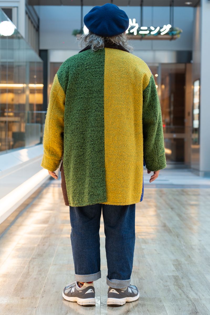 ▶︎原さんのスナップをすべて見る原 宏幸さん(52歳)右腕はグリーン、右身頃はブルー。左はイエローとブラウンのコンビネーションが彩る。で、バックスタイルは別配色。色鮮やかなコートを軸に、華のあるデニムスタイルを実現した。