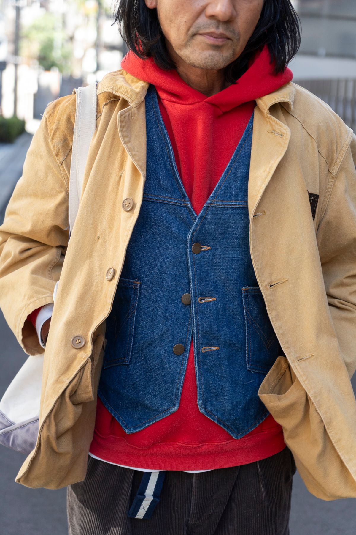 ▶︎セカベーさんのスナップをすべて見るセカベーさん(51歳)古着のジャケットとデニムベストを合わせて、いなたくも洒脱なアメリカンスタイルに。“ラルフ”のワイドなコーデュロイパンツも、ナチュラルな洒落感を演出する。