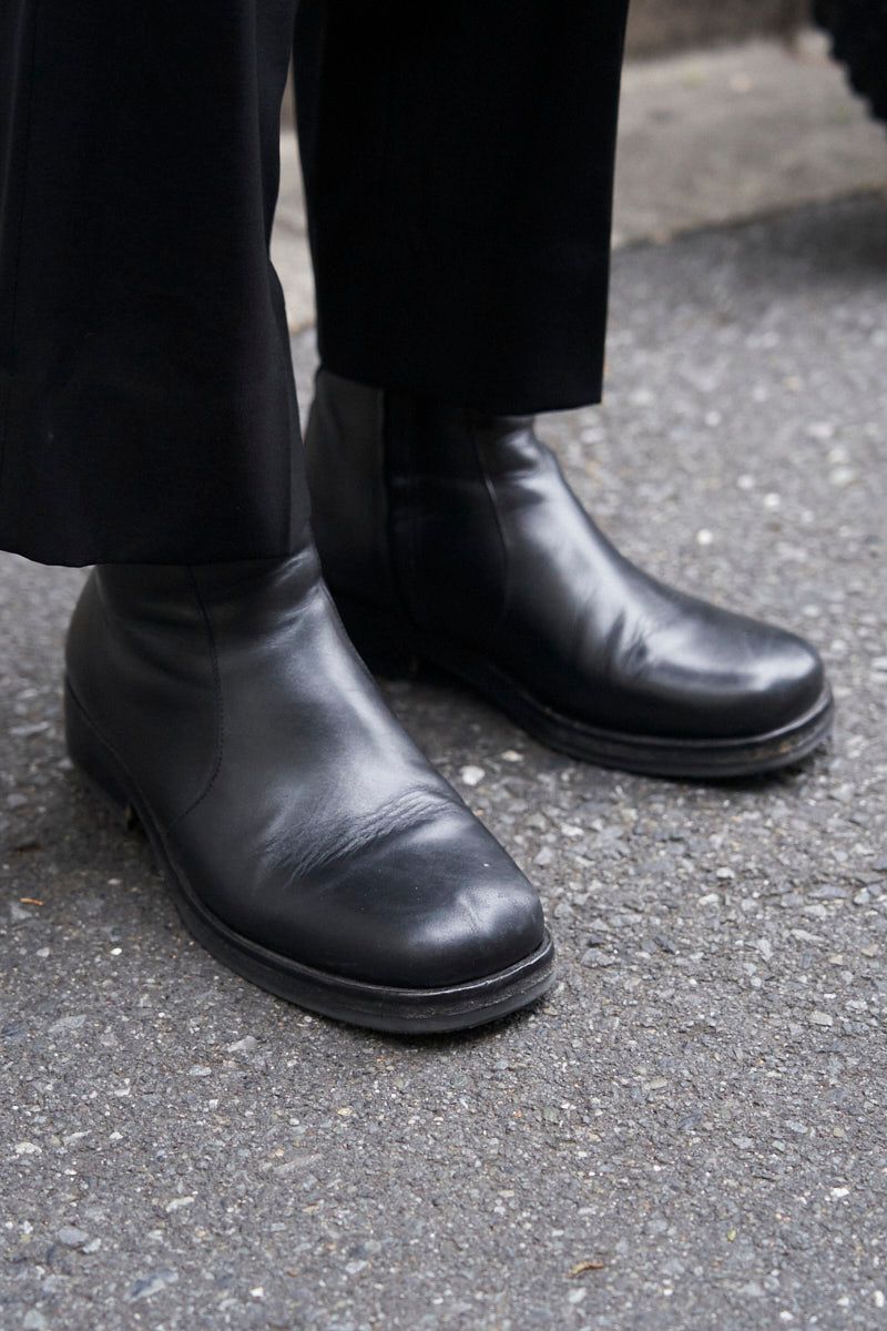 ▶︎デレックさんのスナップをすべて見るデレックさん(29歳)グレースウェットのジップシャツをタックインしたのは飾り気のない黒いスラックス。シンプルだけれど、美しく柔らかな素材感でコーディネイトに表情を生み出している。