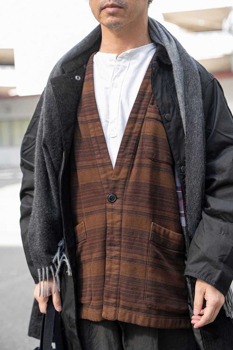 ▶︎渡辺さんのスナップをすべて見る渡辺芳久さん(54歳)ニットマフラーをクルッと巻いて後ろに垂らすスタイルは、前から見たときにシンプルに映るところがポイント。バブアー×キャプテンサンシャインのようなお気に入りのアウターコーディネイトを邪魔せず楽しめる。