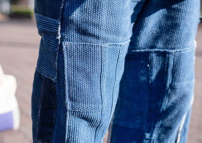 「今日着ているセットアップもリメイクです。前に所属していた事務所の先輩、ムロツヨシさんの家にお邪魔したときにもらった刺し子っぽいデニムのセットアップがベースになっています」。