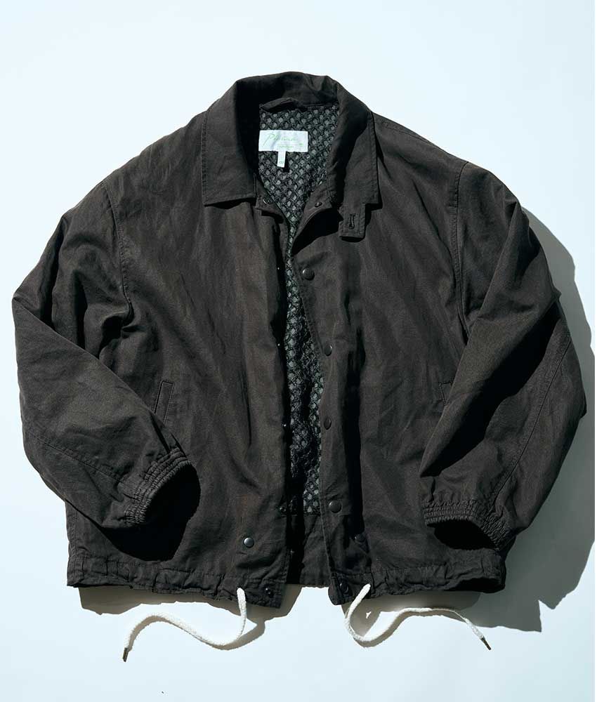周平魂「アウターは『ラジャブルック』のコーチジャケットですね。『東南アジアのおっちゃんが着ている服』をコンセプトにしていているブランドで、裾の紐の感じとか、絶妙にダサいのが格好いいでしょ?」。
