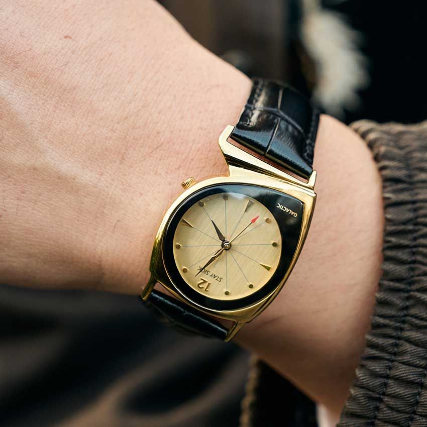 周平魂「『ステイシック』っていう、1950年代のヴィンテージウォッチのレプリカを作っているブランドのものです。元は蛇腹ベルトだったんですけど、今は革ベルトに変えて使っています」。