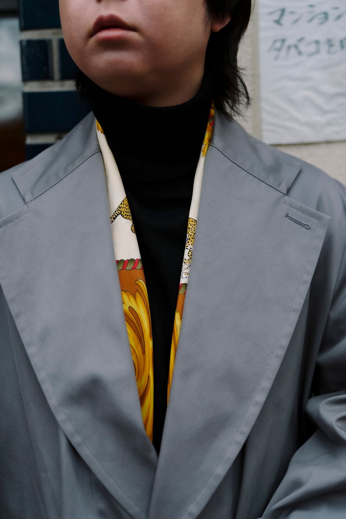 コート=リバーバレイト ニット=エルイー パンツ=ニート シューズ=フラテッリジャコメッティ 眼鏡=アヤメ バッグ=不明 腕時計=ロレックス スカーフ=セリーヌ 靴下=オールドホームステッダー