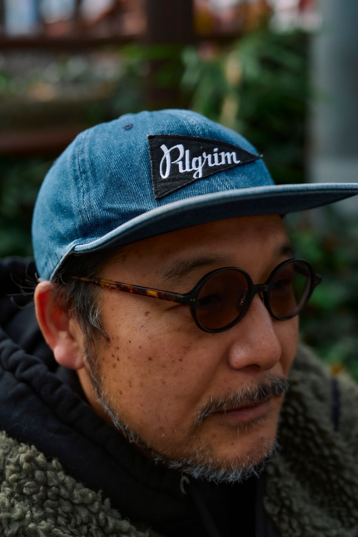ジャケット=ザ・ノース・フェイス パーカ=バイブスカレー パンツ=ピルグリムサーフ+サプライ シューズ=ナイキ 帽子=ピルグリムサーフ+サプライ 眼鏡=オリバーピープルズ アクセサリー=ゴローズ