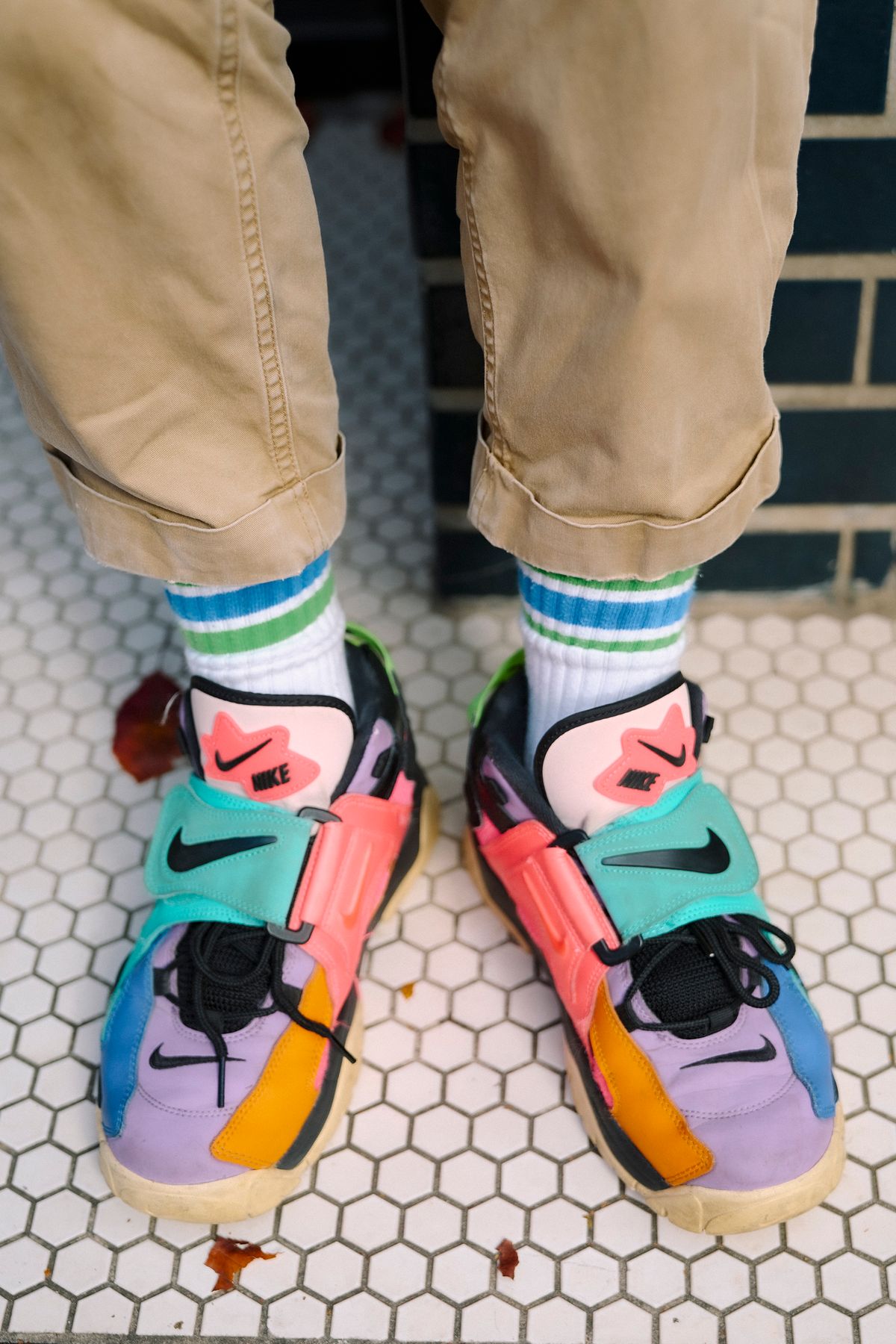 合わせる幅の広いカーキカラーを主軸に据えるだけに、遊びの幅も自由自在だ。例えばこんなふうに、カラフルなスニーカーでハズしても安心。バランス良く仕上がる。