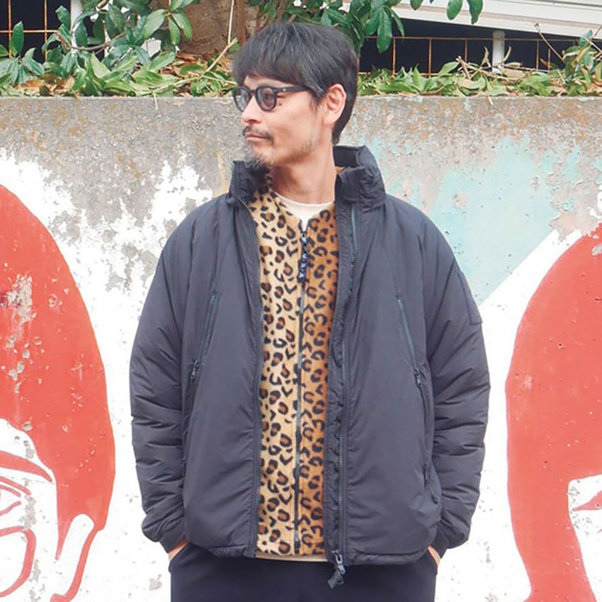 ミルスペックのジャケットをベースに都会的に仕上げたワイルドシングスの定番、ハッピージャケットを着用。パンツもスニーカーもブラックで合わせながらインナーにヒョウ柄のベストを入れることで、不良っぽさと大人っぽさを両立させた。