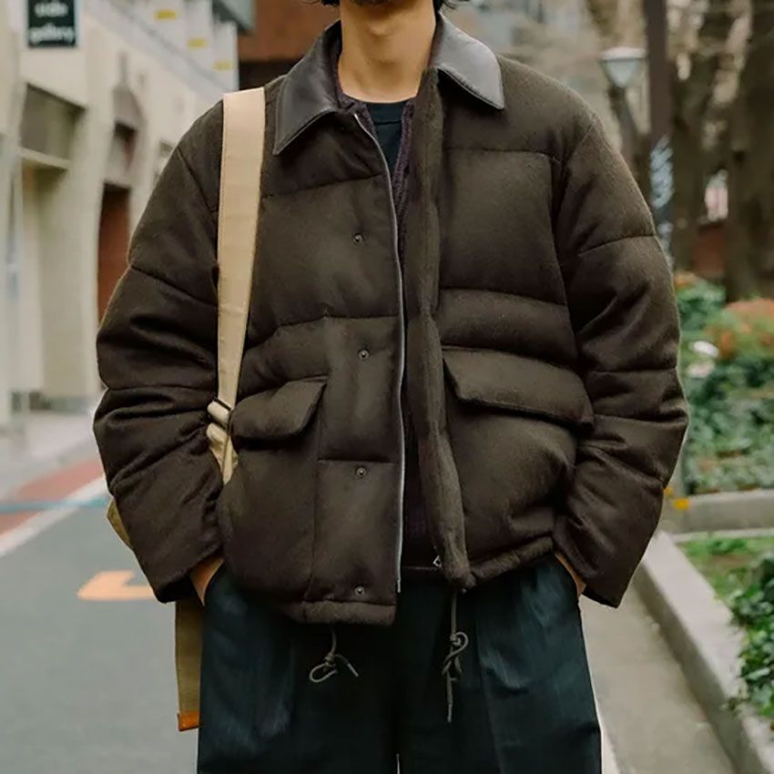 ▶︎福田さんのスナップをすべて見る福田駿希さん(32歳)見た目の温かさはボリューム感だけじゃなく、微起毛のフランネル素材からも伝わってくるオーラリーのダウンジャケット。大人らしいダークブラウンをストライプのスラックスと合わせることでシックな空気感も漂わせる。レザーで切り替えた襟や今どきなボックスシルエットなど、羽織るだけでサマになる工夫が光る。