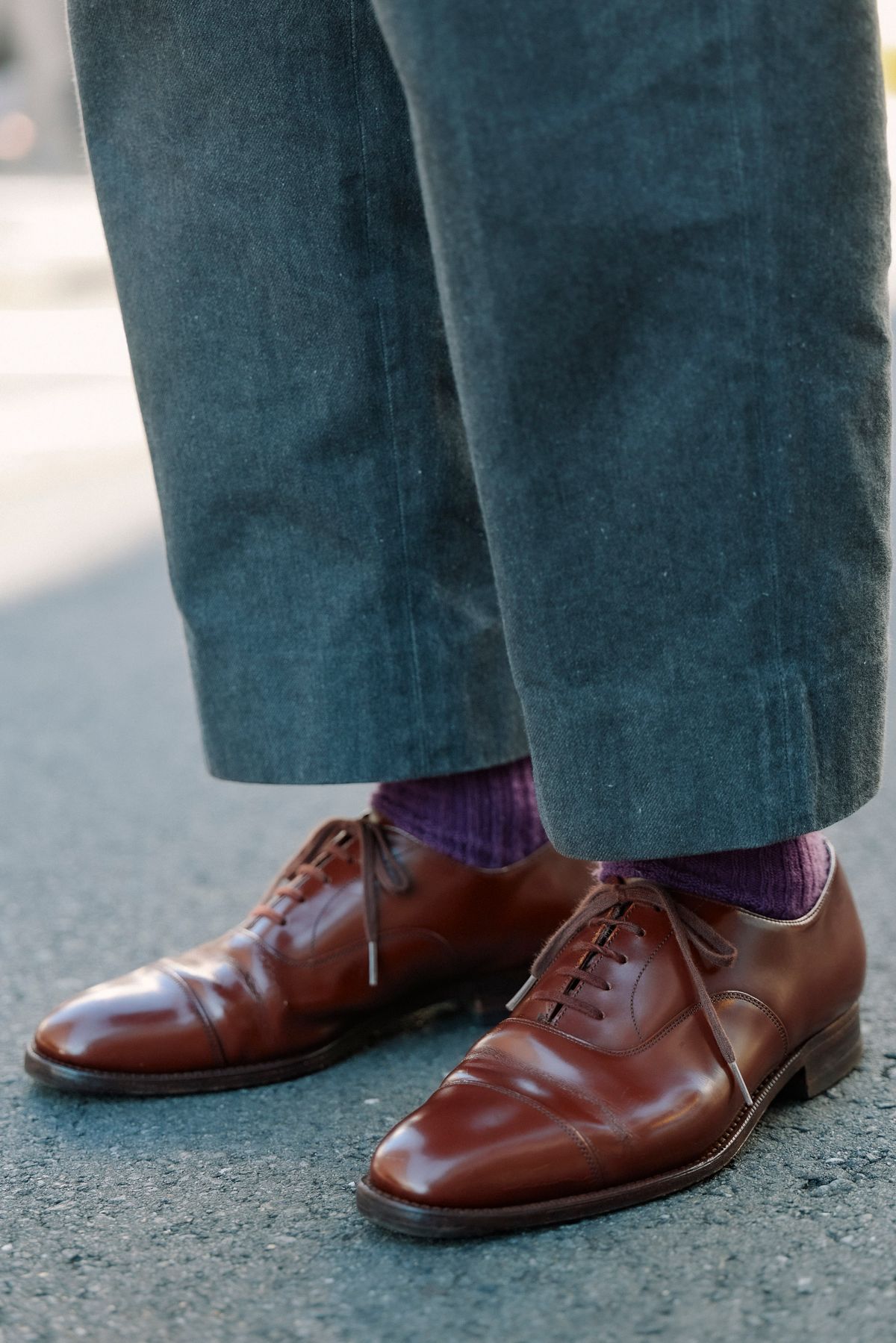 合わせる脇役たちも、自分らしく大人っぽく。コンパクトな編みバッグ、チャーチの光り輝くキャップトゥ、尊いパープルを纏うカラーソックス。めでたくミッションコンプリート!